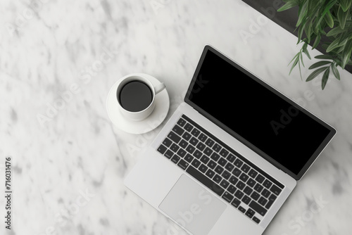 A laptop with a black screen next to a coffee cup and a potted plant on a marble table.