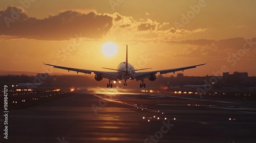 A large airplane approaches for landing, silhouetted against a stunning sunset backdrop. The vibrant colors of the sky reflect on the runway, creating a tranquil atmosphere amidst airport activity.