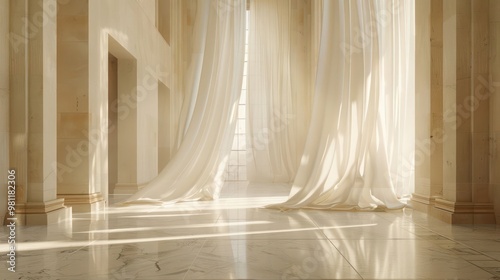 A large, airy room with white curtains billowing in the sunlight that streams through a large window. The room has marble floors and white walls.