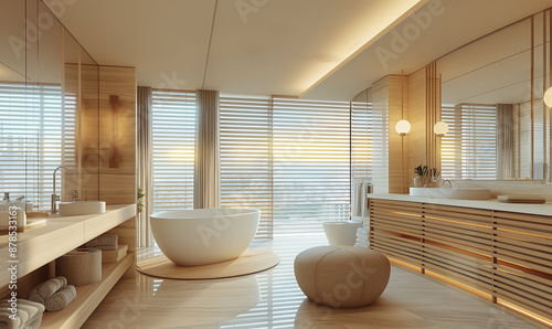 A large bathroom with a white freestanding bathtub, a wooden vanity table and a round bench in front of the tub