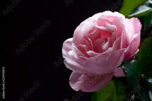 a large blooming delicate pink rose on a dark background