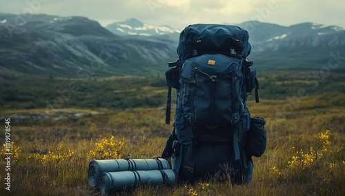 A large blue backpack rests on a grassy hillside surrounded by wildflowers and mountains. A rolled sleeping mat is attached, showcasing a perfect setup for outdoor journeys.