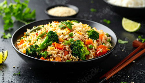 a large bowl of stir fried rice topped with steamed broccoli and sliced carrots, served on a wooden dining table.