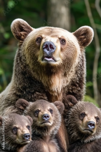 A large brown bear sitting on top of a pile of its baby bears, showcasing the strong bond between mother and cubs