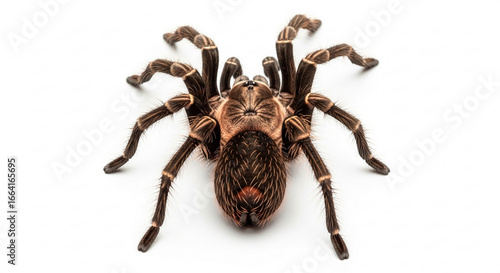 A large brown tarantula spider with hairy legs and body isolated on a clean white background.