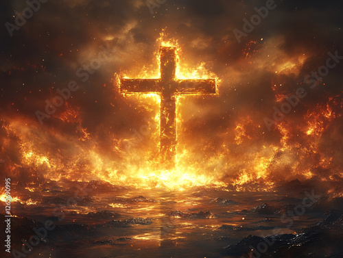 a large, burning cross with flames engulfing it, set against a dark background with smoky or fiery surroundings. The cross is the central focus, and the fire appears intense, casting a dramatic and po