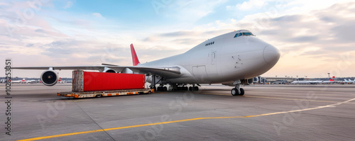 A large cargo airplane parked at an airport, with a red container nearby against a cloudy sky.