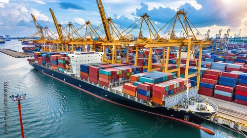 A large cargo ship anchored in the harbor, surrounded by empty docks and cranes, symbolizing a port strike. The ship's deck is visible with no activity, emphasizing the halt in operations. The scene i