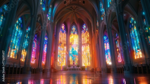 A large cathedral with many colorful stained glass windows. Generative AI.