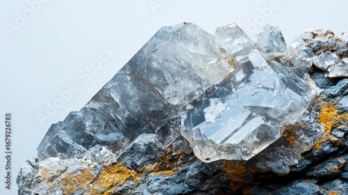 A large, clear crystal on a rocky surface with a blue and yellow mineral in the background.