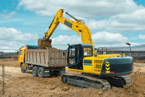 A large construction excavator of yellow color on the construction site in a quarry for quarrying. Industrial image