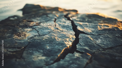 A large, cracked rock faces the calm, reflective waters, revealing a blend of geological history and natural beauty in the golden hour light.