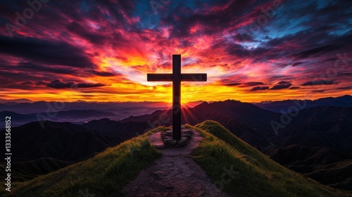 A large cross stands atop a mountain at sunset overlooking hills