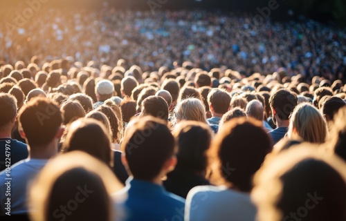 a large crowd at an outdoor concert, captured from behind with a dark background Generative AI