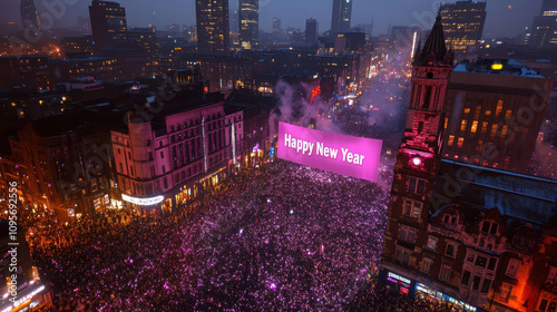 A large crowd celebrating New Year's Eve under a vibrant banner in an urban setting.