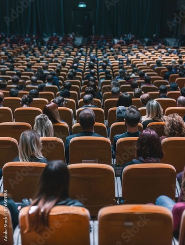 A large crowd of people are sitting in a theater. The audience is watching a movie. The theater is packed with people, and the seats are filled