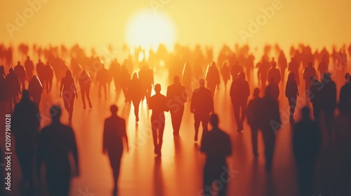 A large crowd of people walks towards a glowing sunset, casting long shadows on the ground. The warmth of the evening sky creates a serene atmosphere as individuals move together.