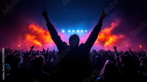 A large crowd raises their hands in excitement as a performer energizes the stage with colorful lights and smoke, creating an electrifying atmosphere at a live concert