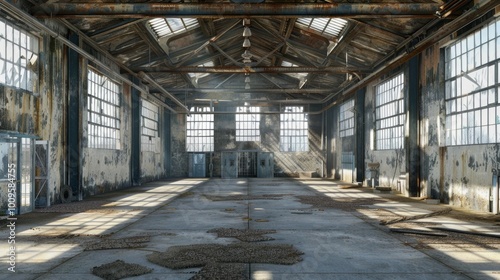 A large, empty warehouse with a lot of windows