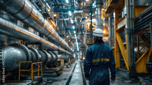 A large factory situated behind an upstream subsea crude oil and gas production facility has a male engineer inspecting industrial pipelines and crude oil drilling rigs from the rear.