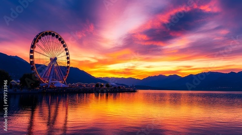 A large Ferris wheel stands tall against a stunning sunset over mountains and water, symbolizing joy, adventure, and the beauty of nature.