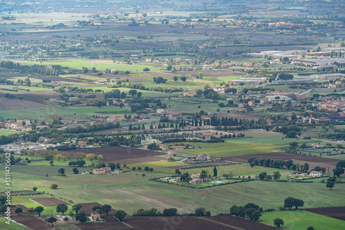 A large field with a few houses in the distance in Gubbio Viewpoint Italy Umbria