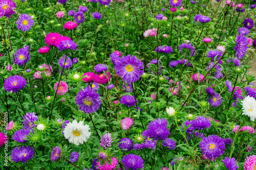 A large flower bed. Beautiful multi colored asters. Background of flowers. Soft focus.