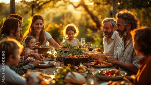 A large French family, spanning multiple generations, gathers together for a delightful outdoor meal in a beautiful garden setting.