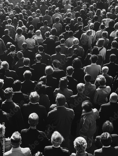 A large gathering of people standing in a conference room, suitable for business or corporate use