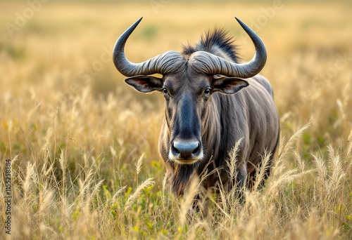 A large gray wildebeest standing in a grassy field, with its distinctive mane and horns visible
