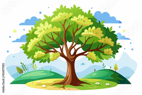A large green tree stands tall in a lush landscape.