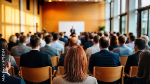 A large group of business professionals sitting in a conference room with a speaker at the front