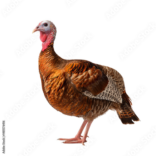 A large, healthy turkey with brown and gray feathers and a bright red wattle, standing proudly on a white background. The turkey has a serious and watchful expression.