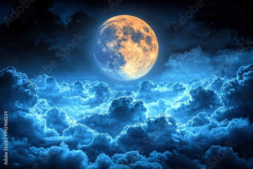 A large, illuminated moon over a sea of fluffy, blue clouds in a starry night sky