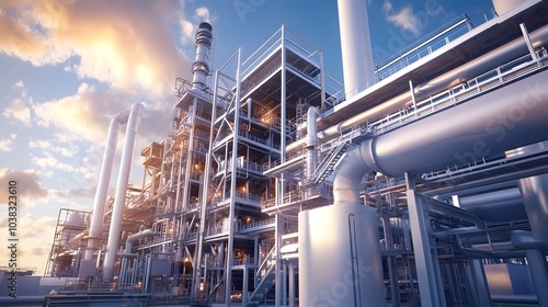 A large industrial building with a lot of machinery and pipes. The building is mostly blue and white