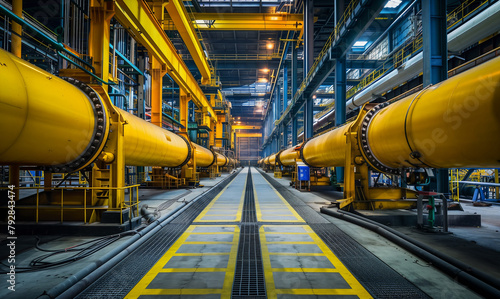 a large industrial building with yellow pipes and yellow flooring on the floor and yellow pipes on the ceiling