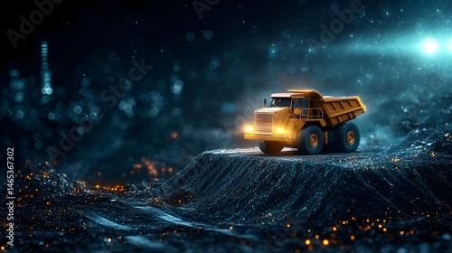 A large industrial dump truck illuminates the rugged terrain of an open pit mining site surrounded by the glow of lights and the sparkle of the night sky