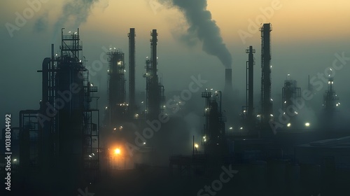 A large industrial plant with many tall towers and pipes. The sky is cloudy and the atmosphere is industrial