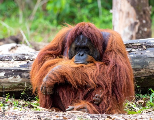 A large male orangutan sits on the forest floor with arms crossed, appearing calm and contemplative