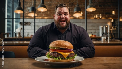 A large man eagerly looks at a massive burger, his eyes full of anticipation. He’s ready to enjoy this delicious, towering meal, savoring every hearty bite
