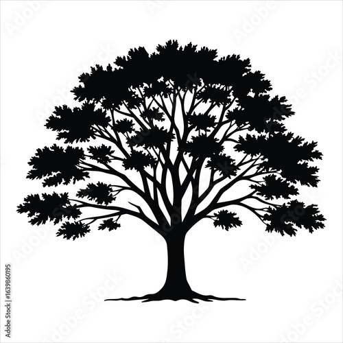 A large mature tree with a full canopy depicted in a striking black silhouette