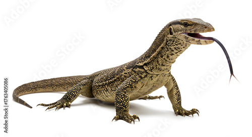 A large monitor lizard sticks out its tongue against a clean white background, showing detailed scales and a fierce expression.