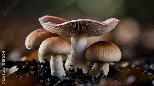 A large mushroom with a curved, pinkish cap stands out, surrounded by two smaller, round brown mushrooms, creating a striking, earthy contrast in a natural display