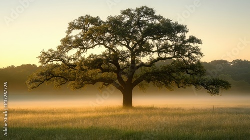 A large oak tree stands in a grassy field filled with a light layer of fog. Ideal for nature, landscape or calm, peaceful background images.