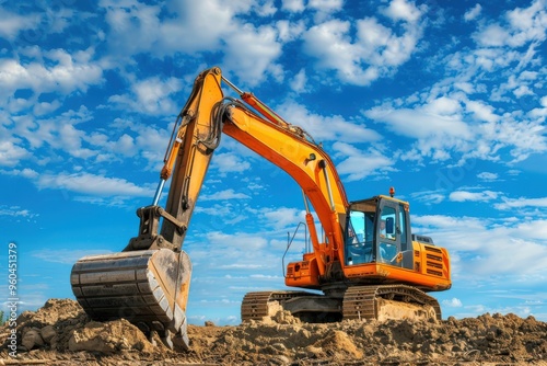 A large orange and black construction vehicle is digging into the ground, generative ai image