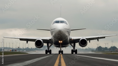A large passenger jet prepares for takeoff on a runway, wind turbines visible in the background.