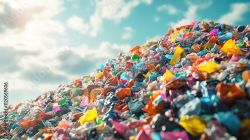 A large pile of colorful plastic waste at a landfill site, showcasing environmental pollution and waste management challenges.