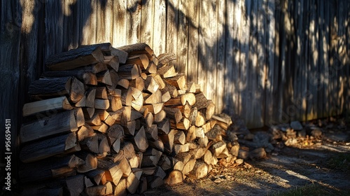 A large pile of firewood logs stacked against a wooden fence, with sunlight casting long shadows, ready for use in a cozy, rustic setting