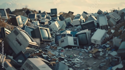 A large pile of old, discarded electronic devices, including monitors, televisions, and computers, in a junkyard.