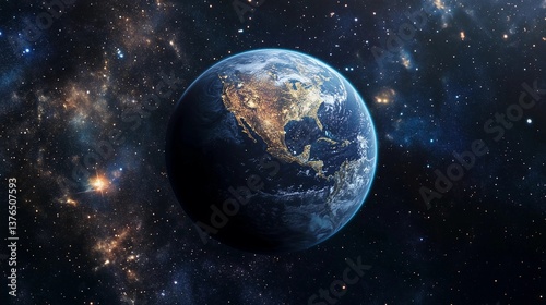 A large planet with a bright blue surface and a bright orange spot in the middle. The planet is surrounded by a vast expanse of stars